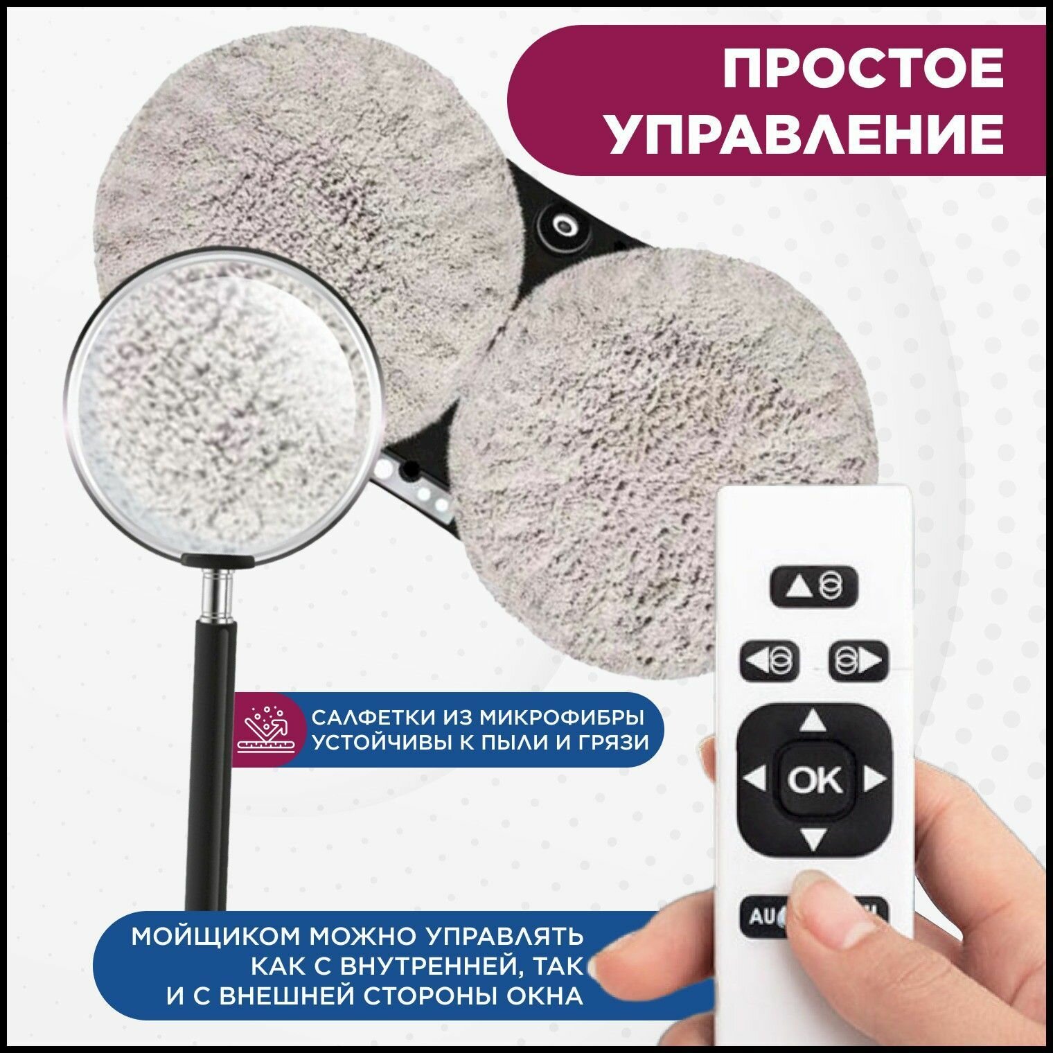 Робот-мойщик окон, с распылителем, страховочный шнур 4 м, пульт ДУ, 90 Вт, 10 сменных тряпок