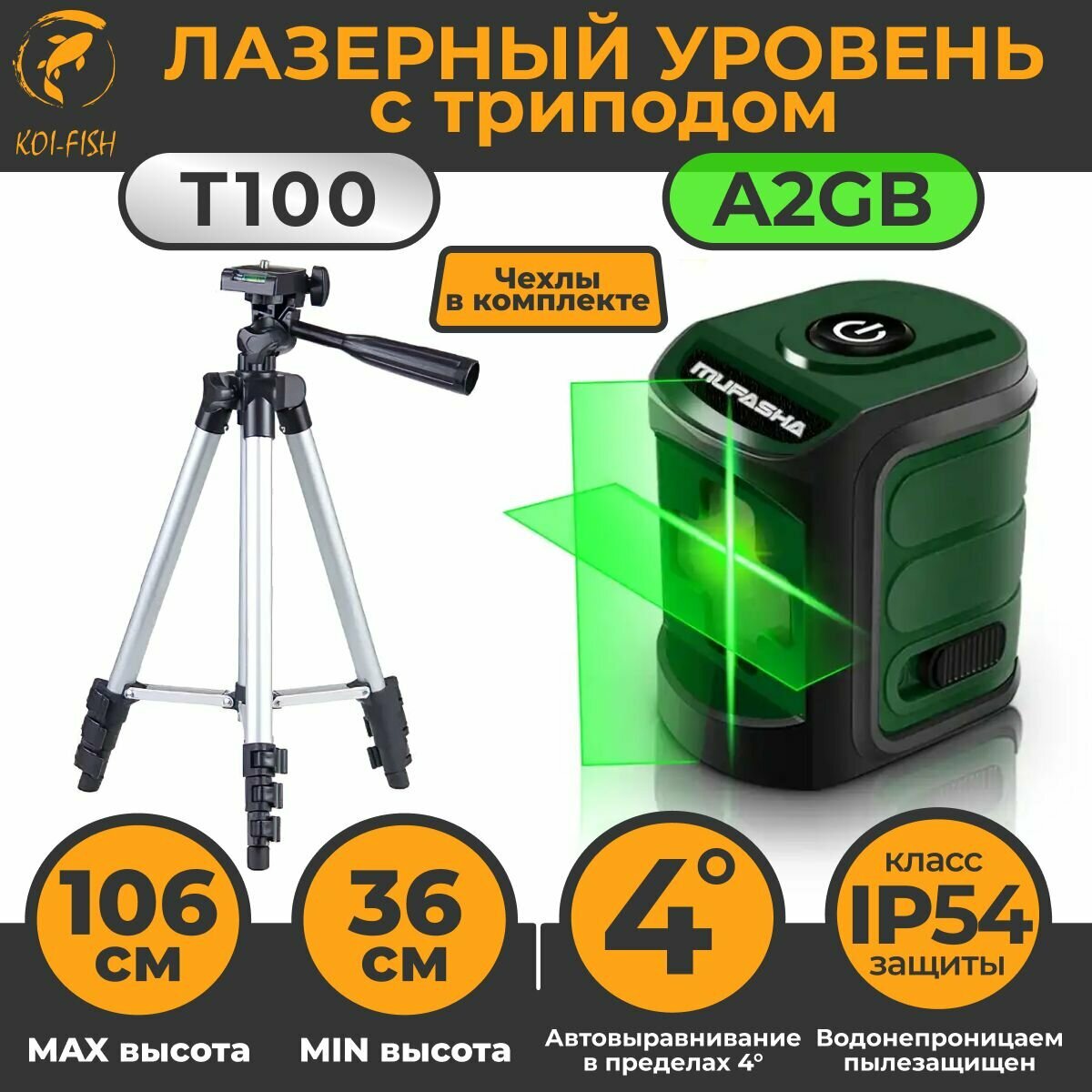 Лазерный уровень с треногой, штативом, нивелир 2 лазерных луча (A2GB зеленый+T100_серый)) информация: