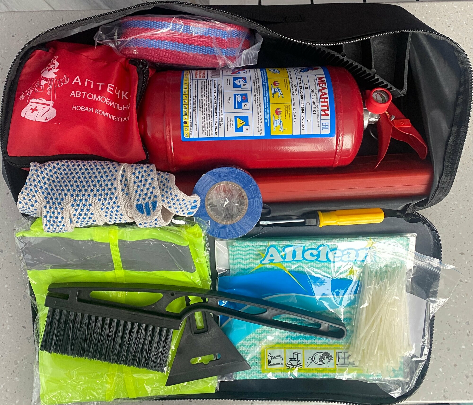 | В наборе | аптечка / жилет светоотражающий / знак аварийной остановки / огнетушитель / перчатки / трос буксировочный |