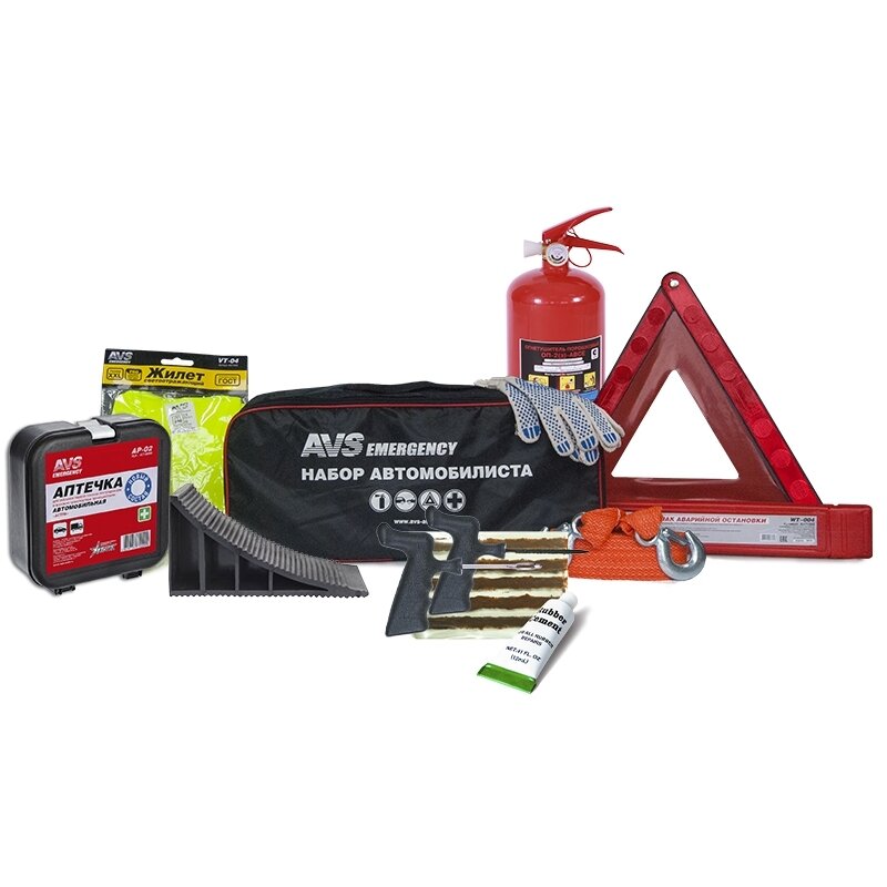 | Подробная комплектация | 1. Жилет светоотражающий VT-05 (70гр/м2) XL (РОССИЯ) 2. Аптечка автомобильная (по приказу) AVS AP-02 (Комплектация аптечки соответствует приказу № 1080н от 08.10.2020 Министерства здравоохранения Российской Федерации) 3. Знак аварийной остановки модель AVS WT-004 4. Трос буксировочный с крюками AVS ET-5S, 5 тонн, 4.5 м, в пакете 5. Перчатки ХБ с ПВХ (белые) 7,5 класс 1 пара AVS RP-01 6. Упор (башмак) противооткатный AVS SM-01 7. Набор для ремонта бескамерных шин AVS RK-110 (8 предм.) 8. Сумка "Набор автомобилиста" AVS SN-01 9. Огнетушитель ОП-2 (ABCE) (Ярпожинвест) |