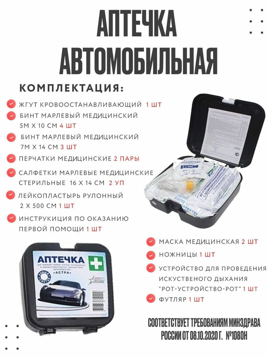 | Подробная комплектация | сумка на молнии, аптечка, знак аварийной остановки в футляре, порошковый огнетушитель оп-2 |
