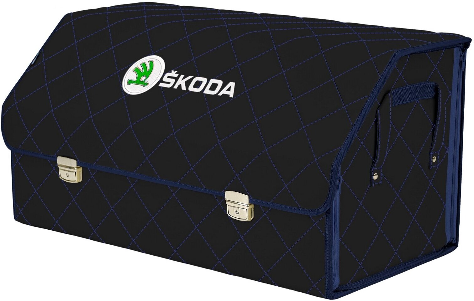 Органайзер-саквояж в багажник "Союз Премиум" (размер XL). Цвет: черный с синей прострочкой Ромб и вышивкой Skoda (Шкода).