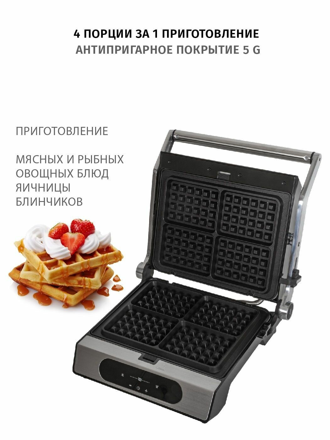 Гриль электрический для дома Pioneer GR1018E / Гриль + Вафельница, 2 комплекта съемных антипригарных панелей 30х23 см / 2200 Вт информация: