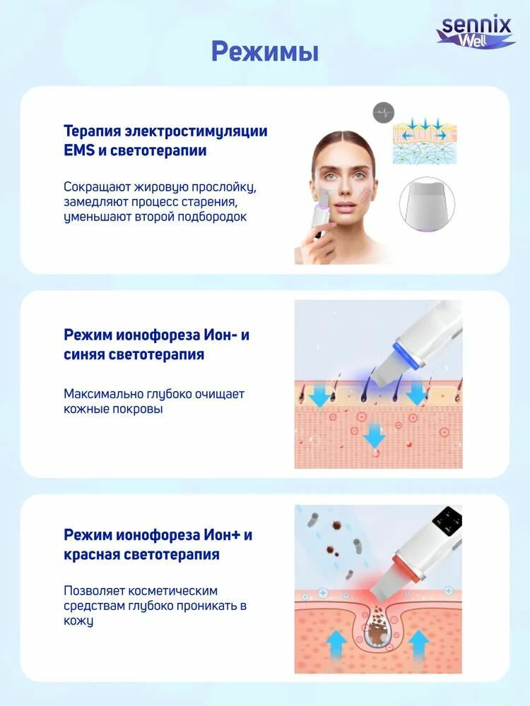 Sennix Аппарат для ультразвуковой чистки лица с 3 режимами работы информация: