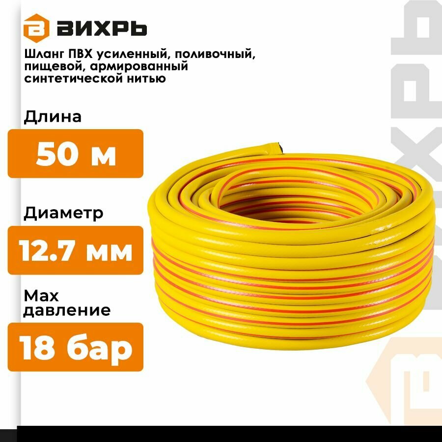 Шланг поливочный ПВХ усиленный, пищевой трехслойный армированный 1/2, 50м (жёлтый) Вихрь информация: