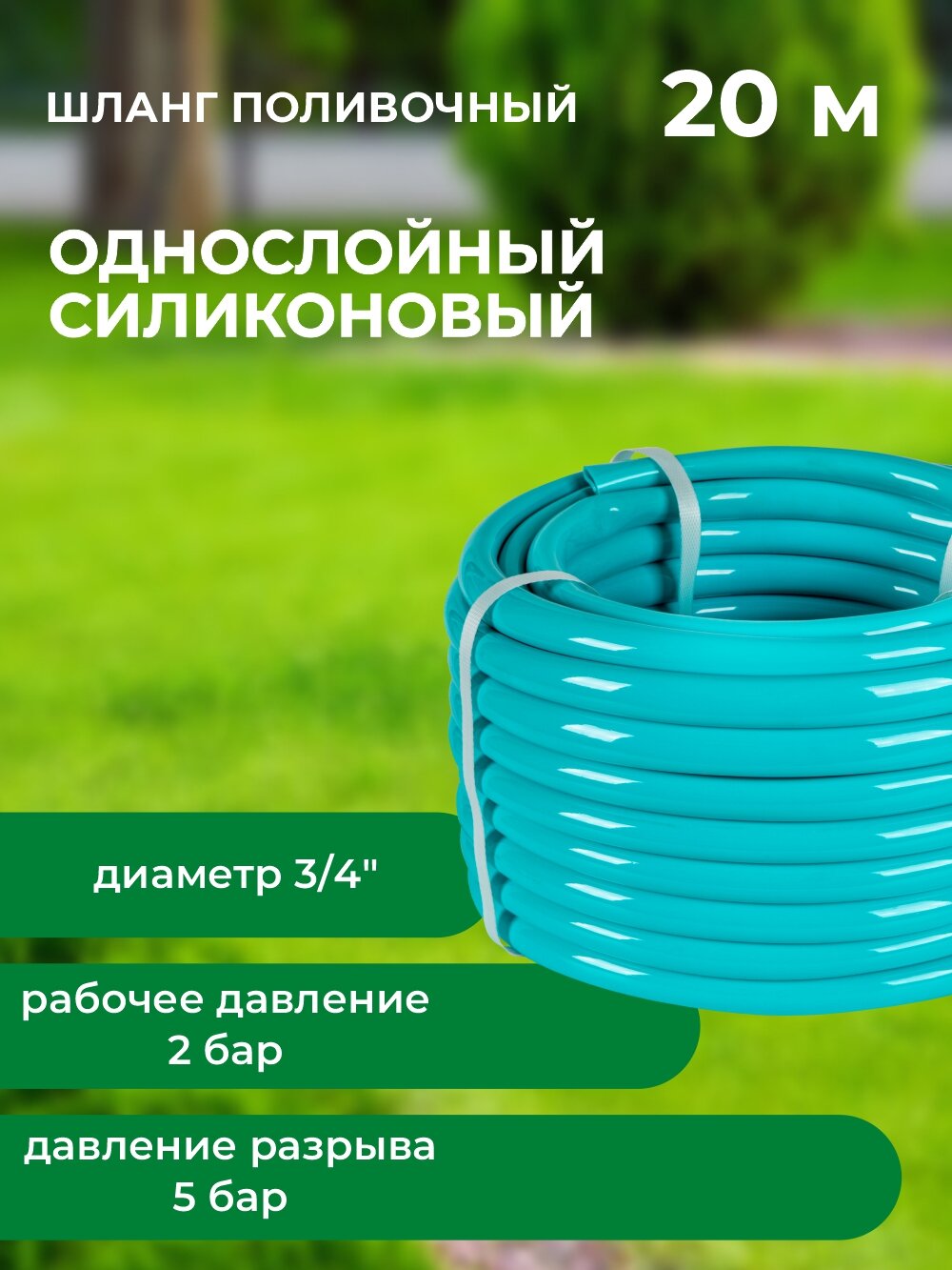 Шланг поливочный Силиконовый однослойный, 3/4", 20 м, бирюзовый, давление 2-5 бар. информация: