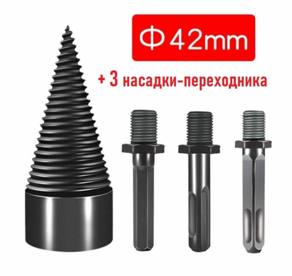 Дровокол-щепокол винтовой конусный с переходниками для дрели и перфоратора. Конус-колун 42 мм. 3 насадки информация: