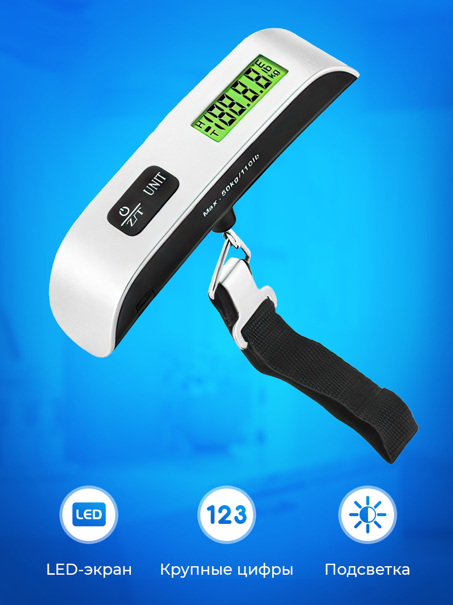 Ручные электронные весы-безмен для багажа до 50 кг с функцией термометра + зеленая подсветка