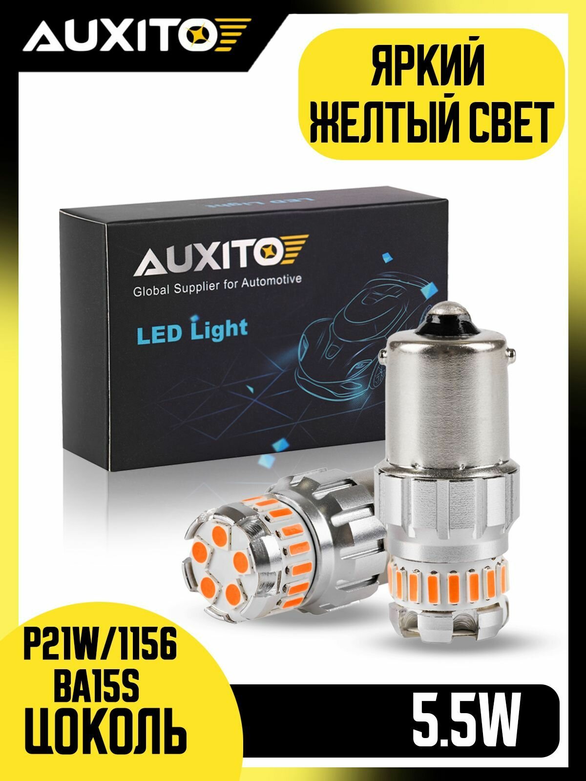 Светодиодная лампа AUXITO 1156 P21W цоколь BA15S 2шт одноконтактная 3000К желтый свет поворотники LED автомобильная информация: