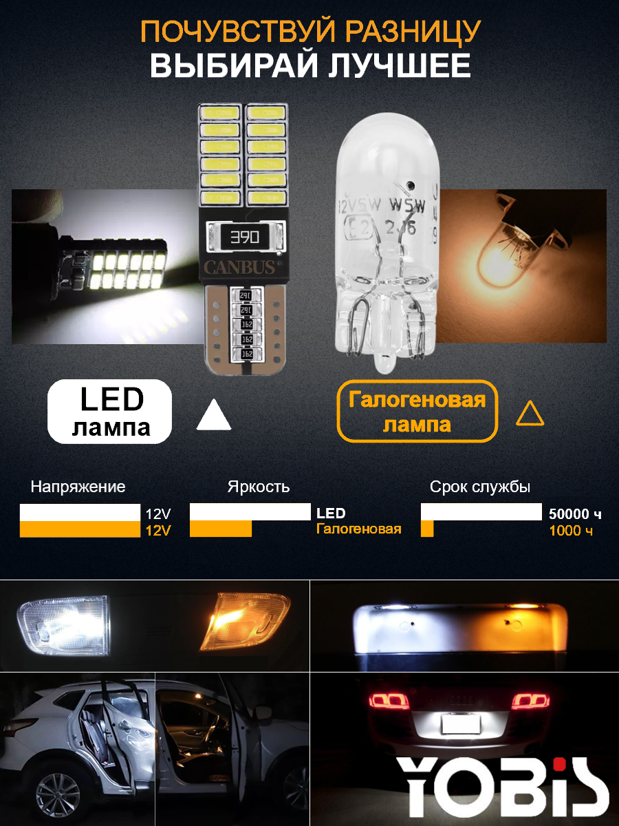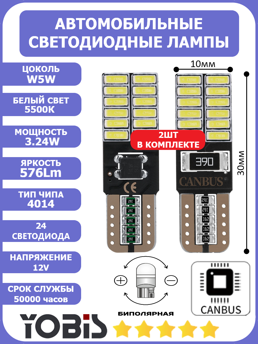 | Дополнительная информация | Лампы YOBIS БИПОЛЯРНЫ и имеют встроенную обманку CANBUS, что обеспечивает работу в 99% автомобилей без ошибок. Супер яркие с направленным приятным светом. Область применения: — передние и задние габаритные огни - дневные ходовые огни - лампы заднего хода - лампы в стоп сигналах - указатели поворота - стояночные огни - противотуманные задние фонари - освещение салона - подсветка дверей и ног - освещение номера - освещение багажника - освещение подкапотного пространства - освещение бардачка. |