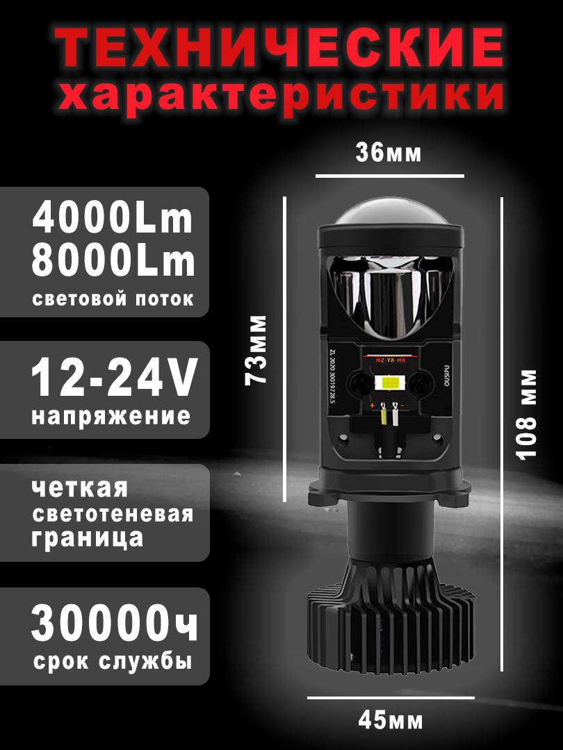 Автомобильные светодиодные LED лампы H4 с линзой, Y6, 5500 К, для дальнего и ближнего света, комплект 2 шт. 1 924 ₽