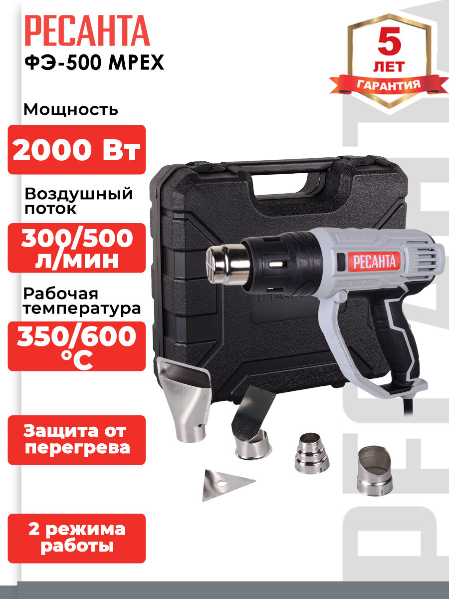 Строительный фен Ресанта ФЭ-500 MPEX (2000 Вт, 300/500 л/мин, 600 °C, 0.75 кг) информация: