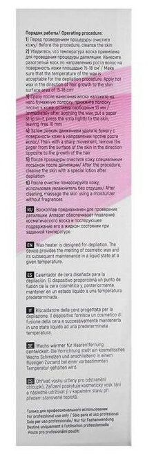 | Способ применения | Как пользоваться воскоплавом для депиляции картриджами правильно? Пошаговая инструкция: За полчаса до депиляции хорошо моют тело, проводят скрабирование, чтобы убрать ороговевшие частички кожи. Пользуются лосьоном, подготавливающим кожные покровы к процедуре. Помещают картридж в воскоплав (когда кассета свежая, с нее обязательно убирается защитная пленка). Пленочный воск для депиляции в картриджах разогревают 20-25 минут, пока он не расплавится до нужной консистенции. Выключают прибор из розетки. Перевернув картридж, наносят рабочий материал (по линии роста волосков) на обрабатываемую область. Поверх на воск помещают полоску или ленту из ткани, бумаги. Ждут несколько минут, пока материал не остынет, а затем срывают полоску против роста волосков (тянут не вверх, а вдоль тела). |