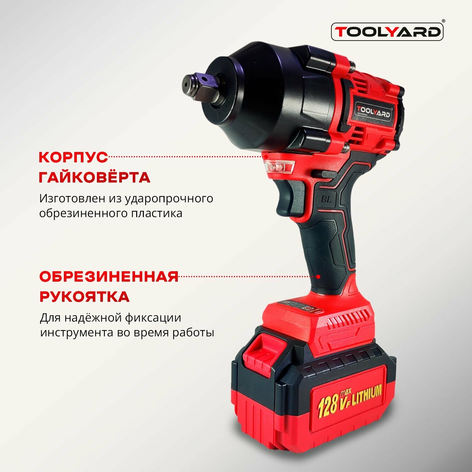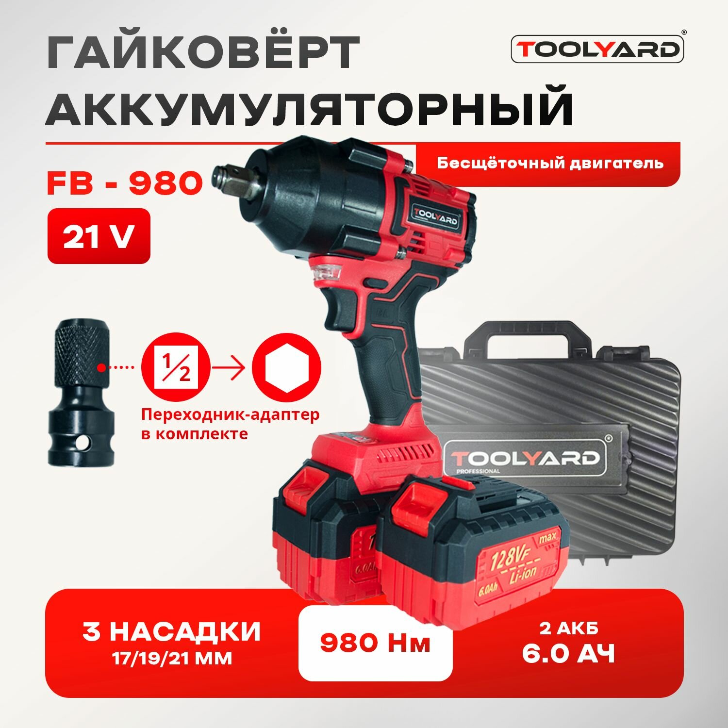 Гайковерт ударный бесщеточный / TOOLYARD / FB-980 (Li-ion-2шт, 6Ач, 980 Нм, 0-3200 об/мин, 0-3600 уд/мин, ЗУ, кейс) информация: