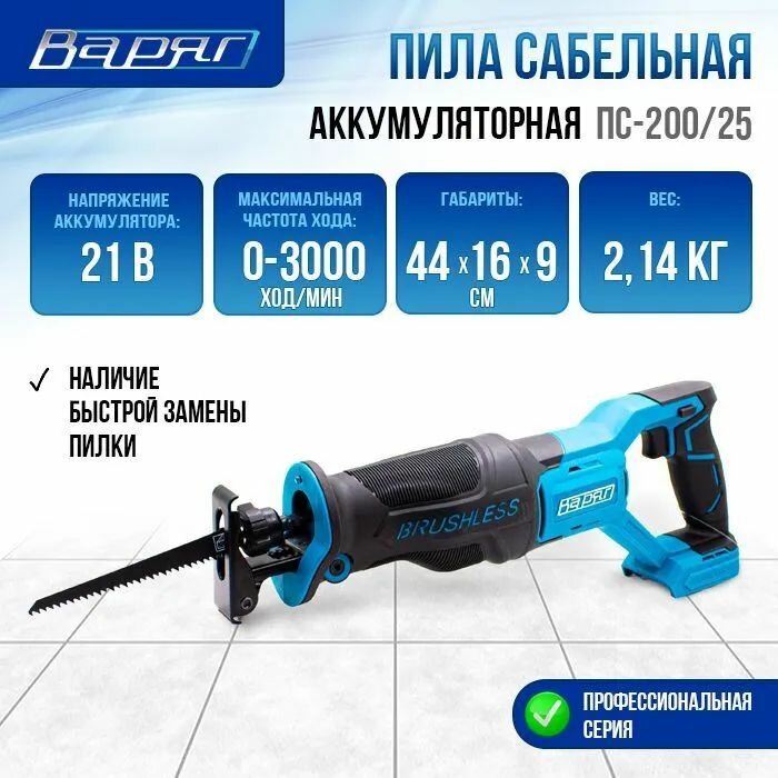 Пила сабельная аккумуляторная варяг ПС-200/25 (бесщеточная 21V, 3000 ход/мин) информация: