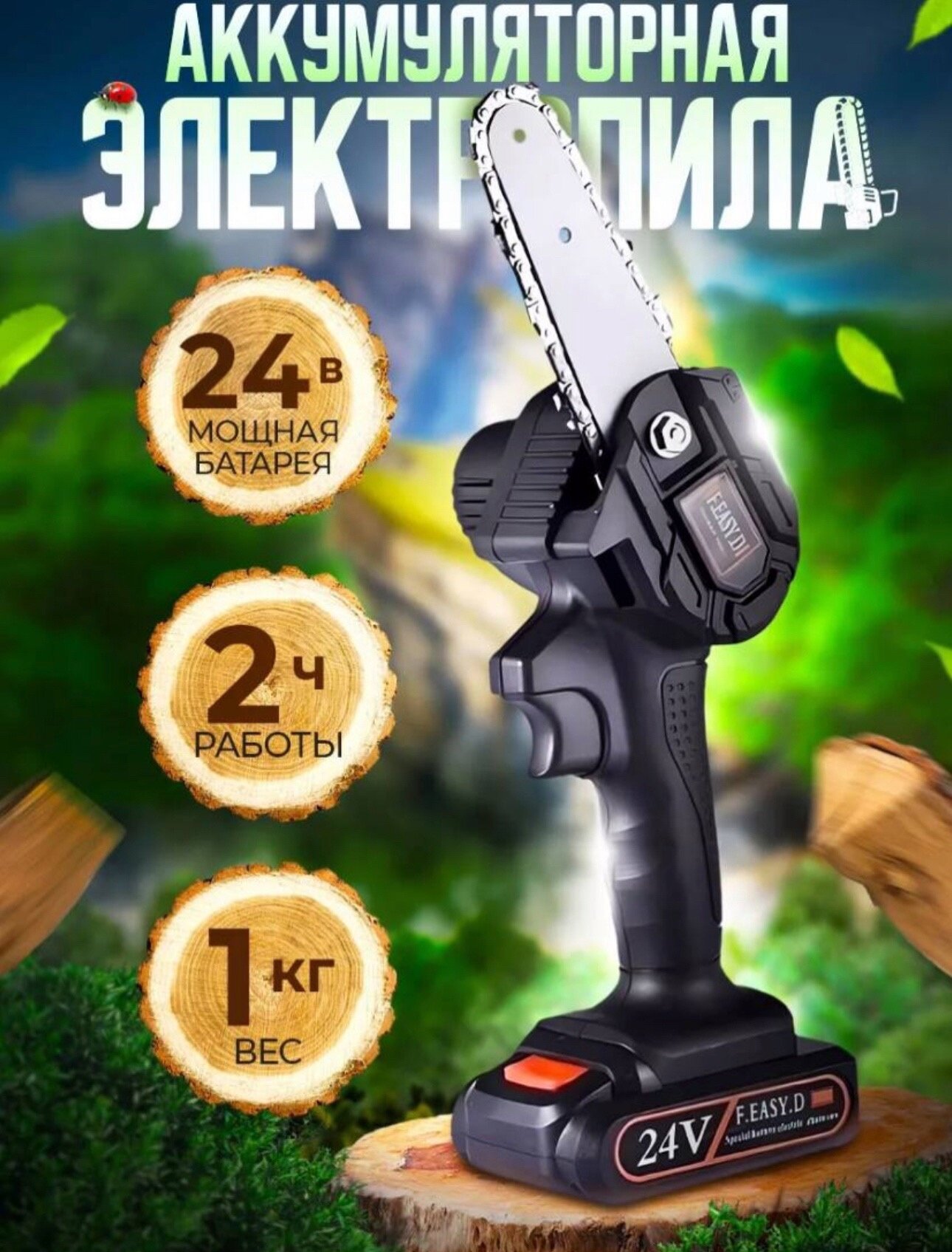Пила аккумуляторная цепная 24Вт один аккумулятор Li-ion 2000 mAH
