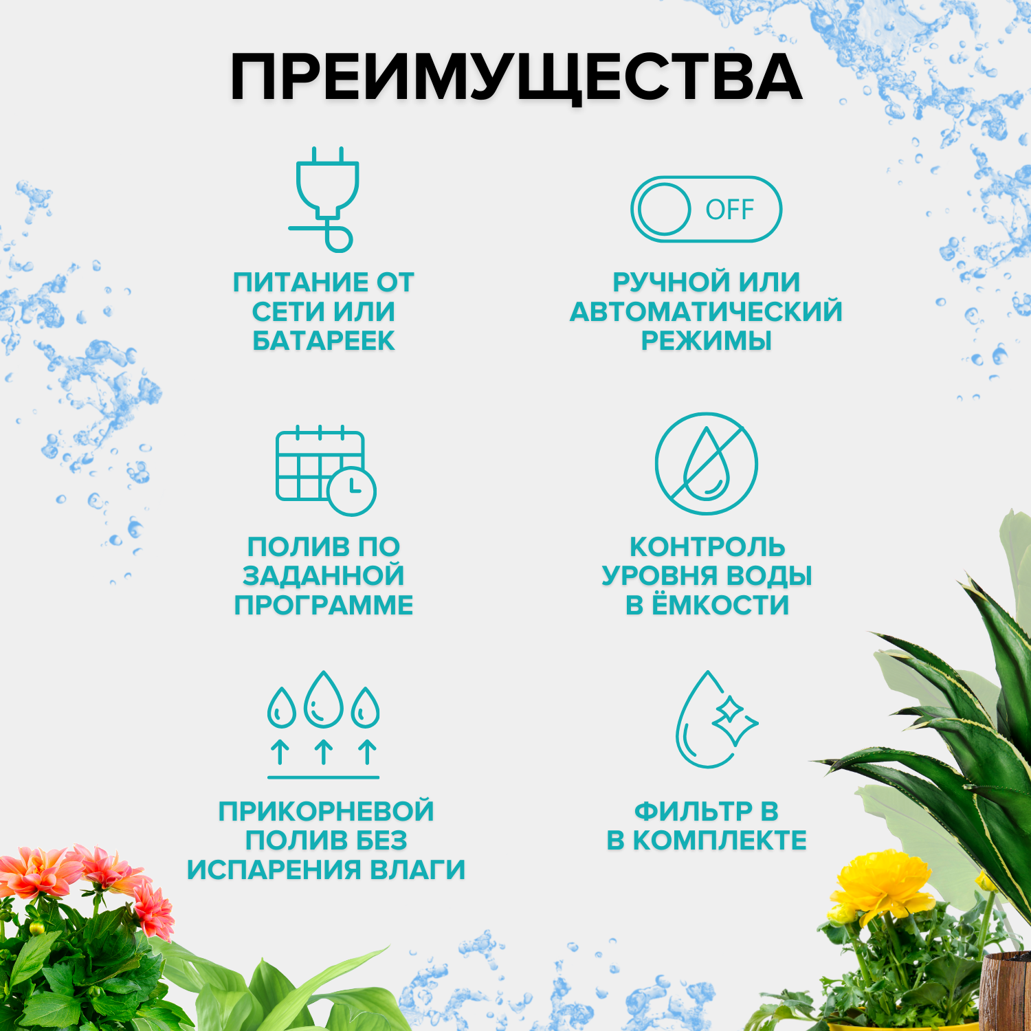 | Дополнительная информация | Предостережение: не рекомендуется добавлять в воду удобрения, которые могут привести к засору системы мелкими частицами, что повлияет на корректную ее работу. |