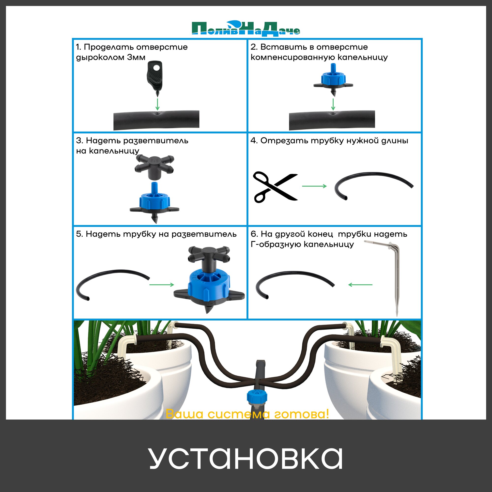 | Комплектация | Микротрубка ПВХ 3/5 мм; Капельница компенсированная; Разветвитель для микротрубки; Капельница-колышек Г-образная; Дырокол для капельниц |