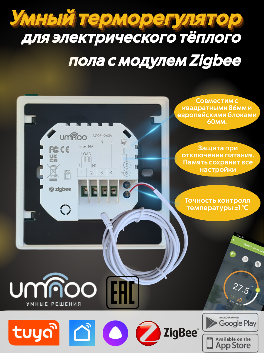 Умный терморегулятор (термостат) Umnoo для электрического теплого пола на 16А, Zigbee | Smart Life + Алиса| Белый информация: