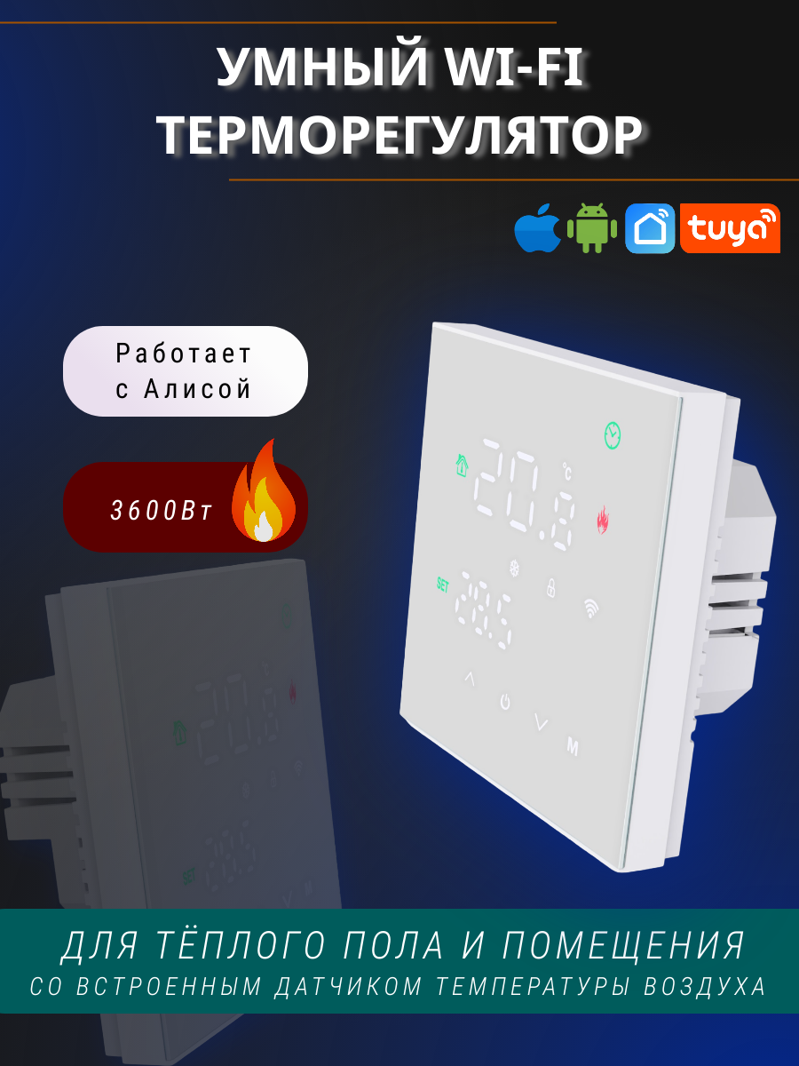 Терморегулятора (термостата) для теплого пола электрический с сенсорным экраном, встроенная wi-fi функция, мобильное приложение Smart Life, работает с умным голосовым помощником – Алисой 3 400 ₽