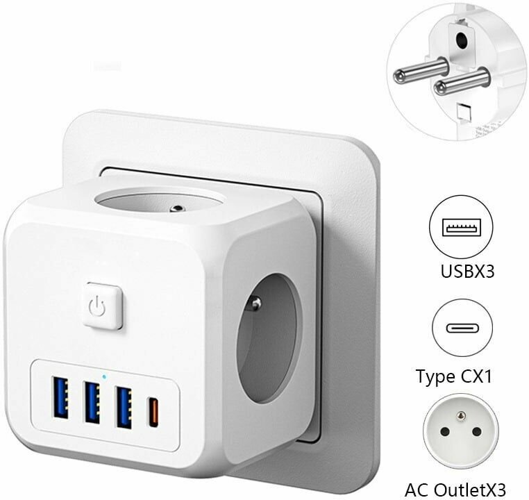 Отзывы на Тройник для розетки, с USB, Type-C PowerCube, 3 гнезда 220V, 3 USB 2100mA / 1 Type-C 3400mA, c заземлением, защитные шторки, 16 A/4000 Вт.