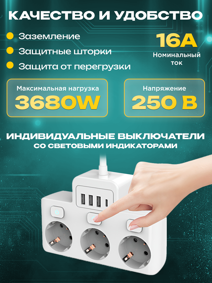 | Особенности | USB порт, выключатель на корпусе, световая индикация, шторки на розетке |
