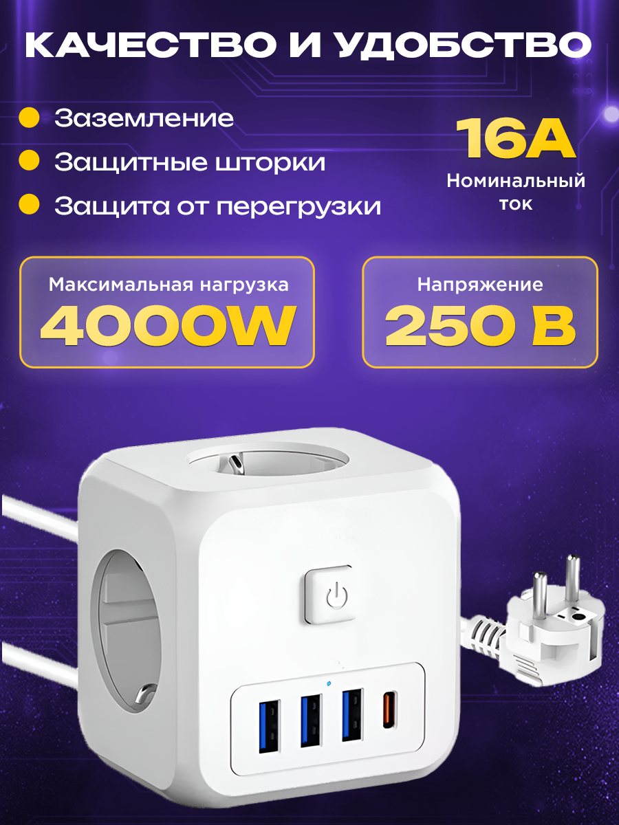 Отзывы на Сетевой фильтр LENCENT с 3 розетками, 3 USB и 1 Type-C, удлинитель 1,5м