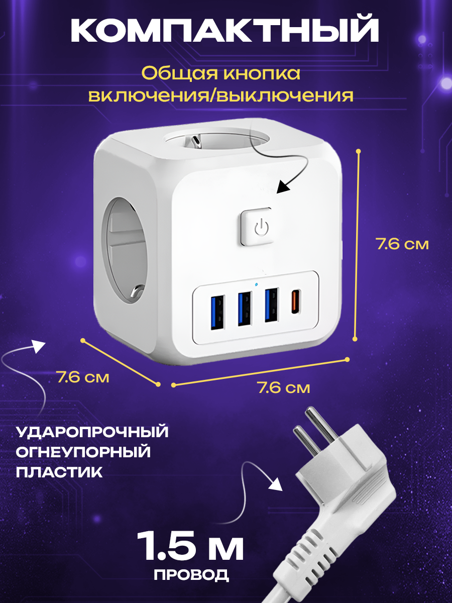 Сетевой фильтр LENCENT с 3 розетками, 3 USB и 1 Type-C, удлинитель 1,5м информация: