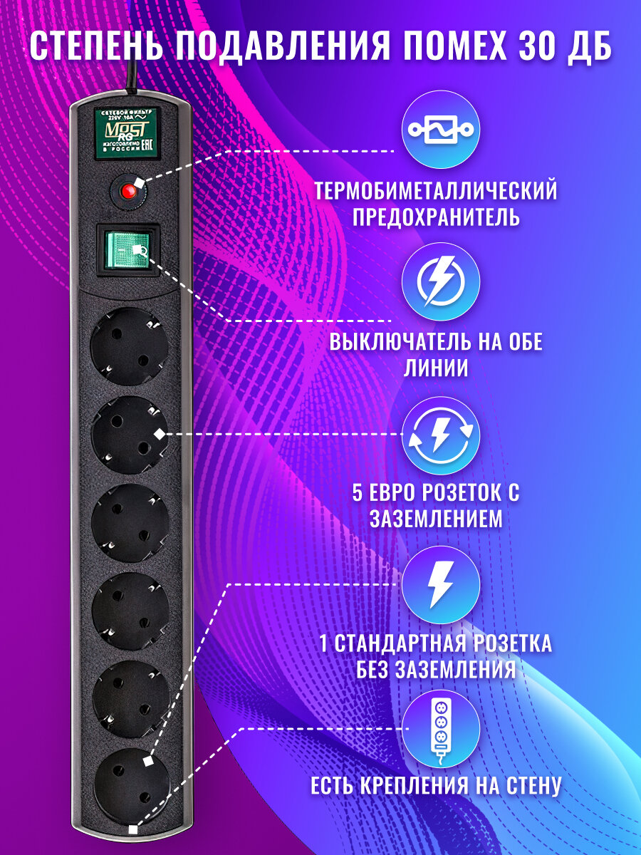 Сетевой фильтр с защитой удлинитель с предохранителем Most LRG 7 метров 2200Вт черный информация: