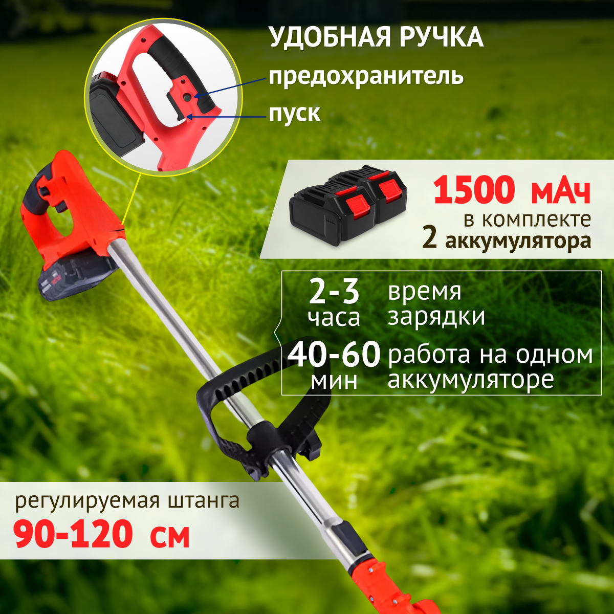 Триммер аккумуляторный для травы с 2 аккумуляторами Косилка садовая ручная Газонокосилка с двумя аккумуляторами