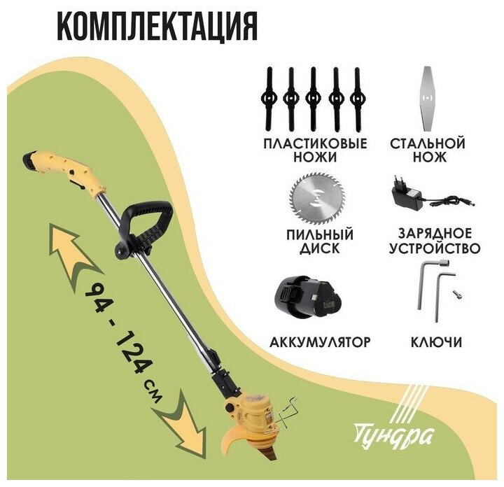 Отзывы на Триммер аккумуляторный тундра, 12 В, 300 Вт, 1.2 Ач, 12000 об/мин, телескопическая штанга