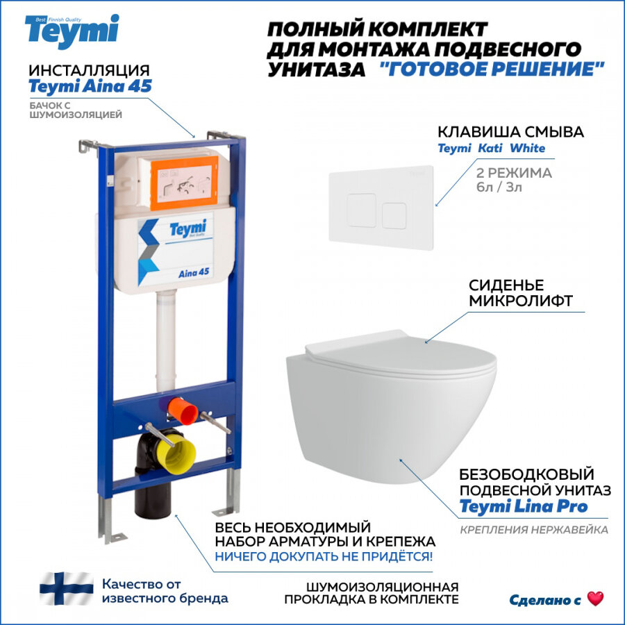 Готовое решение Teymi: Инсталляция Aina 45 + клавиша смыва Kati белая + унитаз Lina Pro F01431 информация: