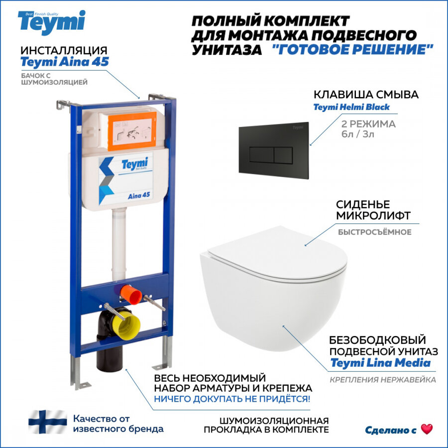 Готовое решение Teymi: Инсталляция Aina 45 + клавиша смыва Helmi черная + унитаз Lina Media F01271 информация: