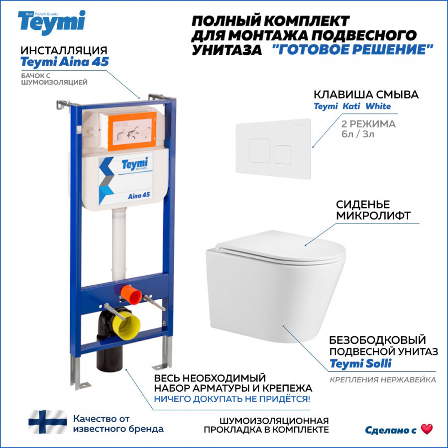 Готовое решение Teymi: Инсталляция Aina 45 + клавиша смыва Kati белая + унитаз Solli F01191 информация: