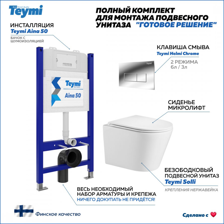 Комплект Teymi "Готовое решение": Инсталляция Aina 50 + клавиша смыва Helmi хром + унитаз Solli F00509 информация: