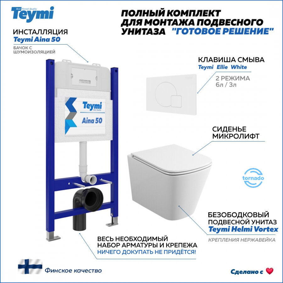 Комплект Teymi "Готовое решение": Инсталляция Aina 50 + клавиша смыва Ellie белая + унитаз Helmi Vortex F00568 информация: