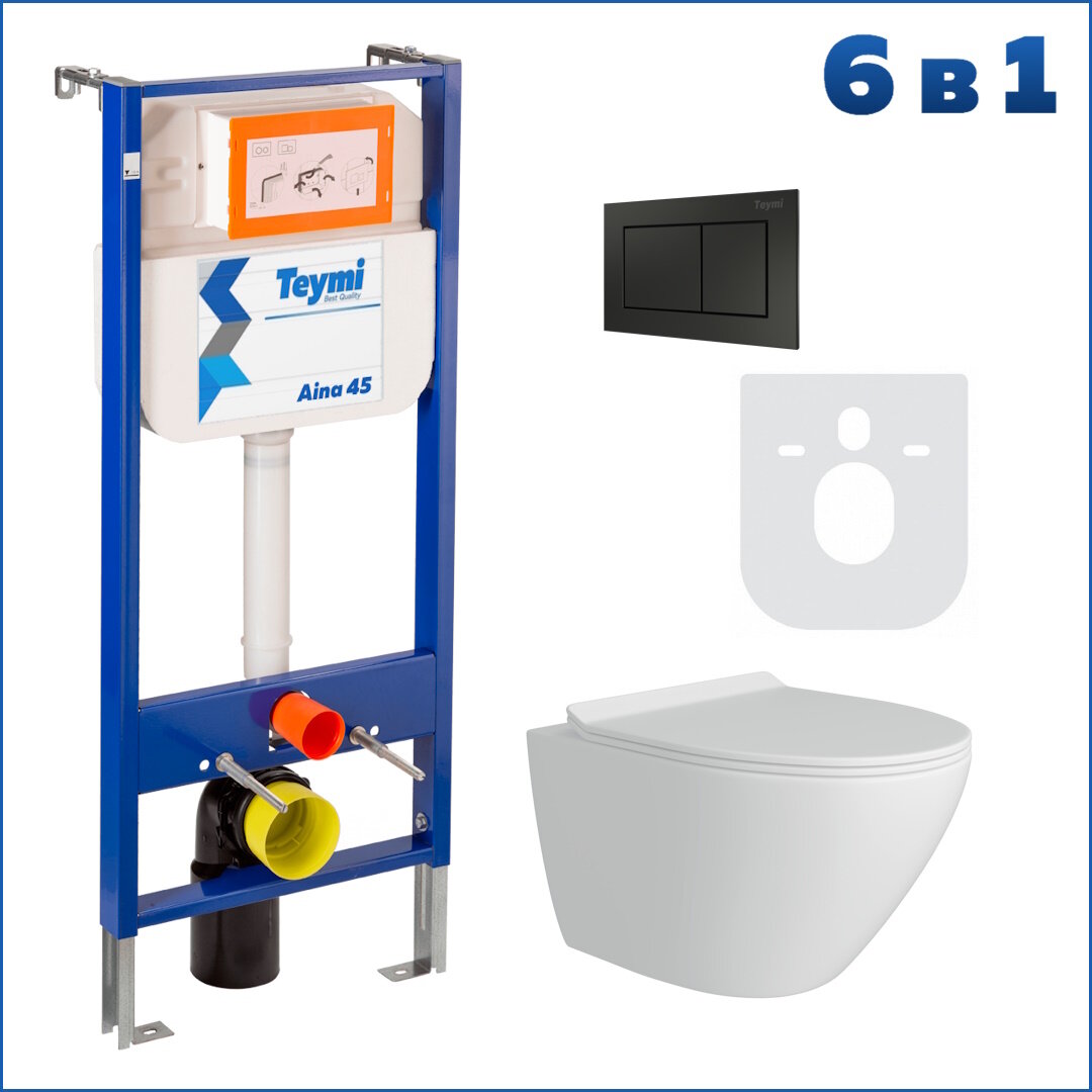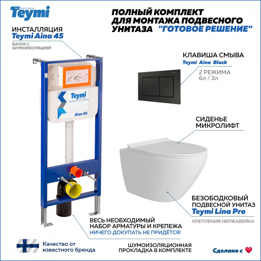 Комплект Teymi "Готовое решение": Инсталляция Aina 45 + клавиша смыва Aina черная + унитаз Lina Pro F01425 информация: