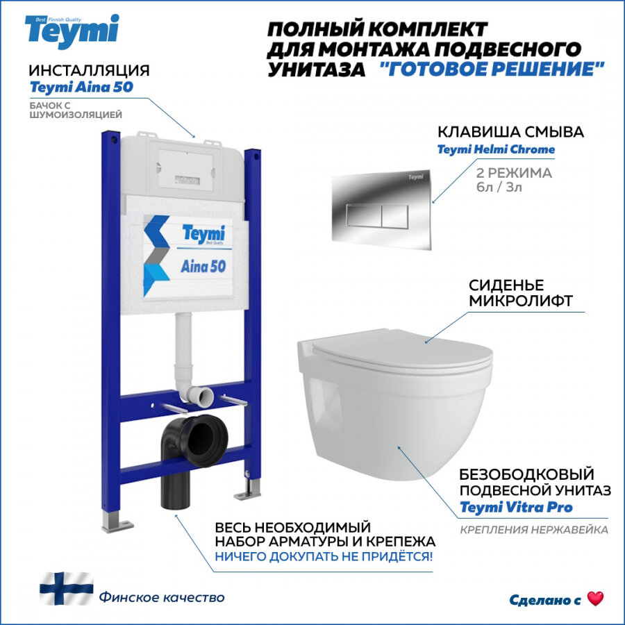 Комплект Teymi "Готовое решение": Инсталляция Aina 50 + клавиша смыва Helmi хром + унитаз Vitra Pro F00674 информация: