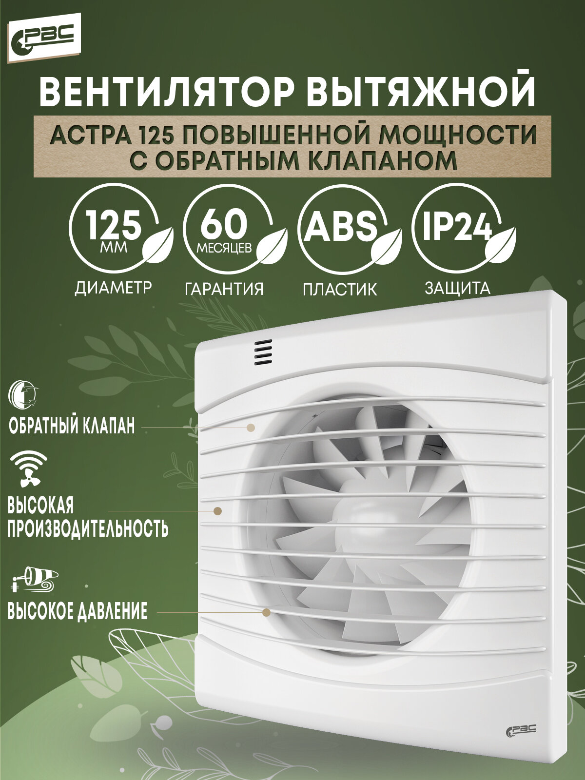 Вентилятор повышенной мощности с обратным клапаном РВС Астра 125, 23 Вт, 41 дБ, 228 м3/ч информация: