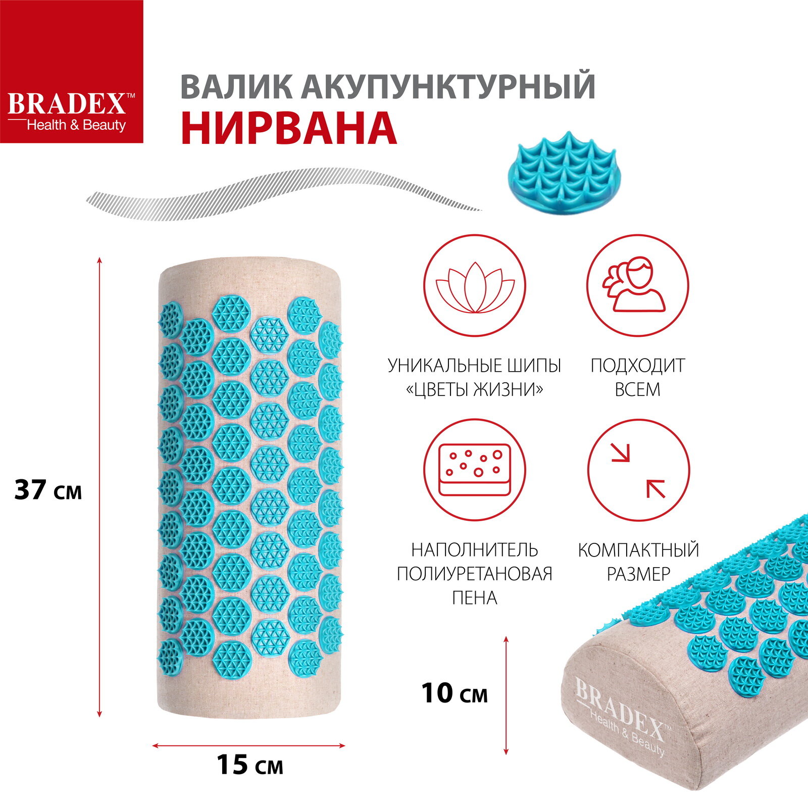 Валик акупунктурный Нирвана бежевый, бирюзовые шипы, премиум-серия, Аппликатор Кузнецова игольчатый информация: