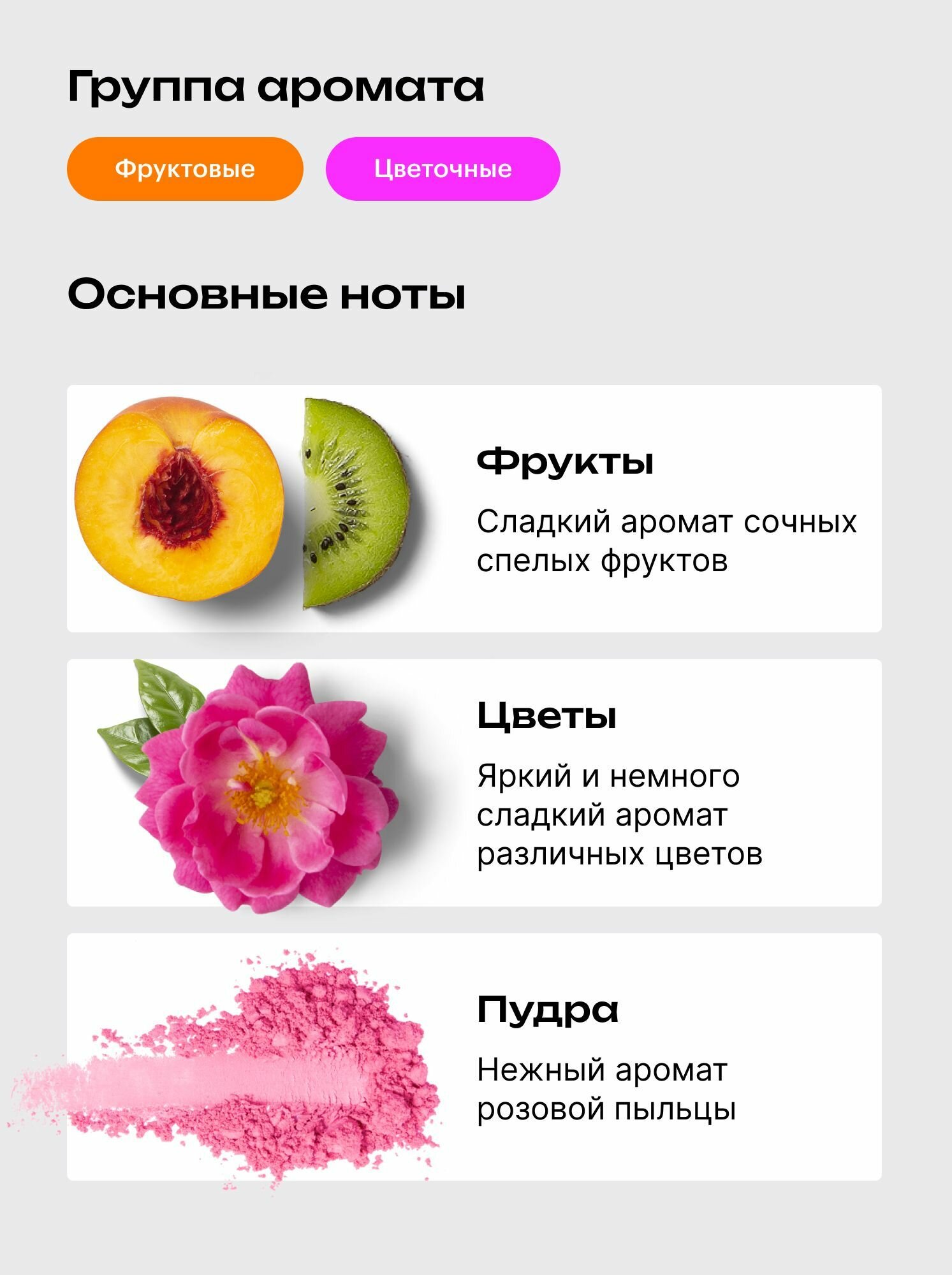 Базовые ноты | Сладкий аромат сочных спелых фруктов |