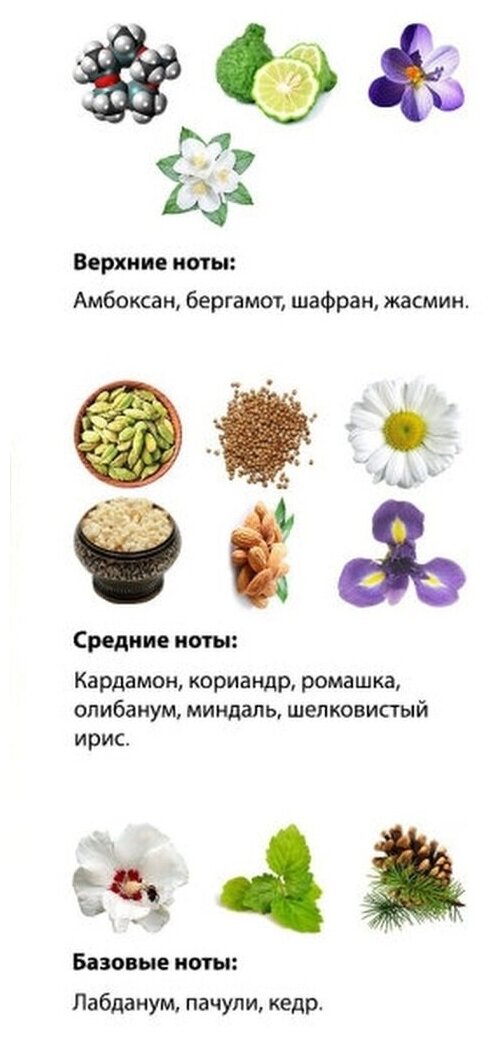 | Верхние ноты | амброксан, бергамот, шафран, жасмин |