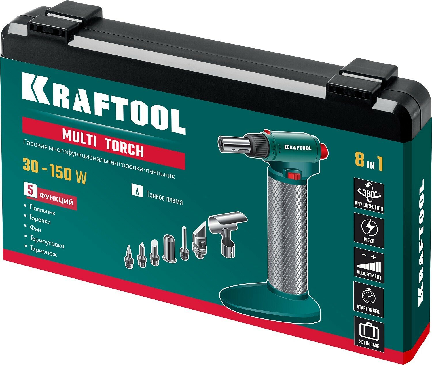 Газовый паяльник KRAFTOOL MULTI TORCH набор 8-в-1, 30-150 Вт, горелка, фен, пьезоподжиг, 1300С