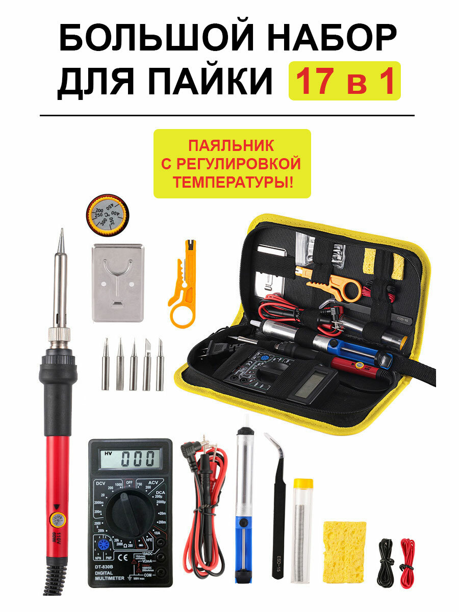 Набор №2-1, мультиметр DT-830D, цифровой паяльник, подставка, отвертка индикаторная, нож металл, припой, набор жал-5шт, оловоотсос, пинцеты.