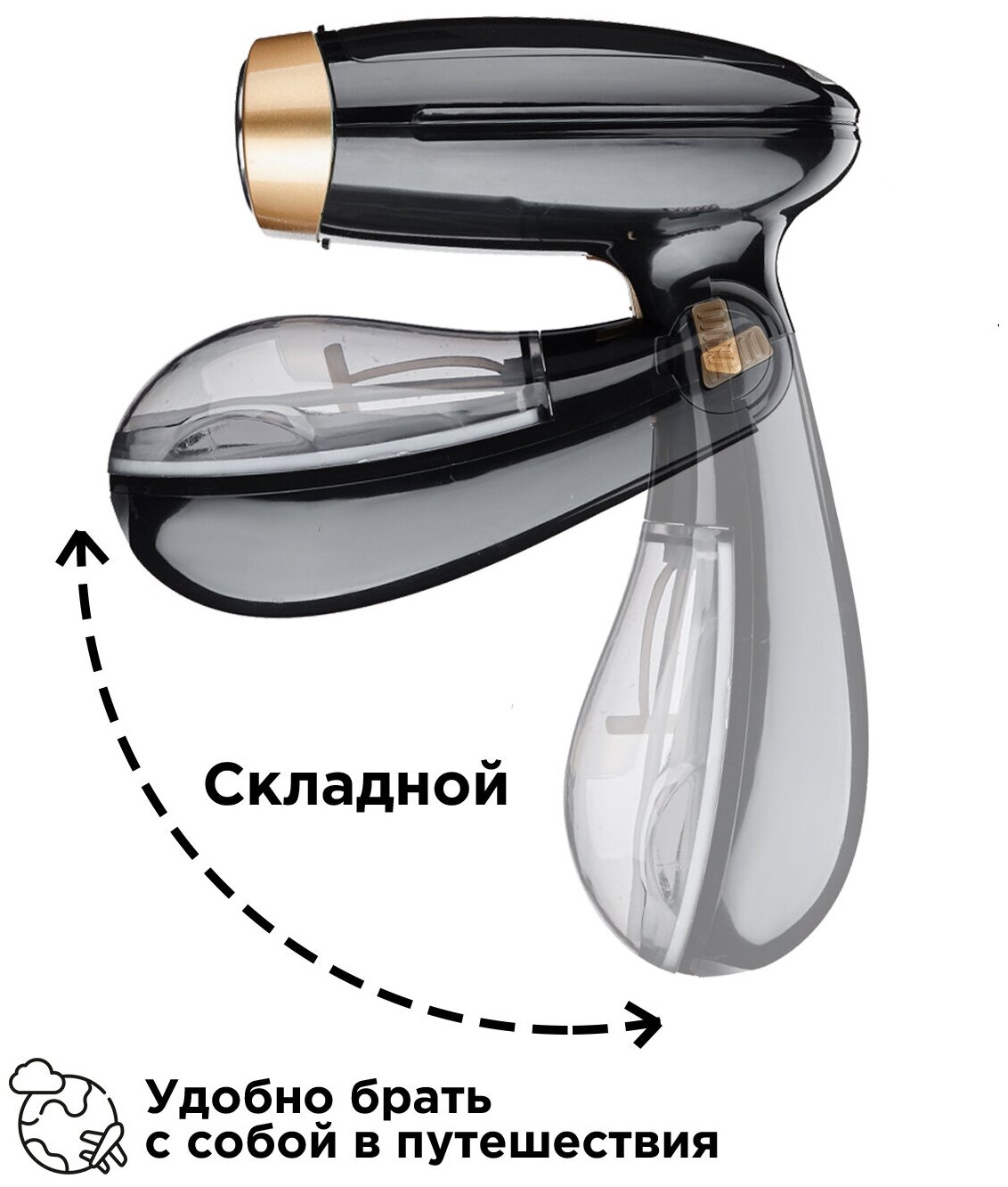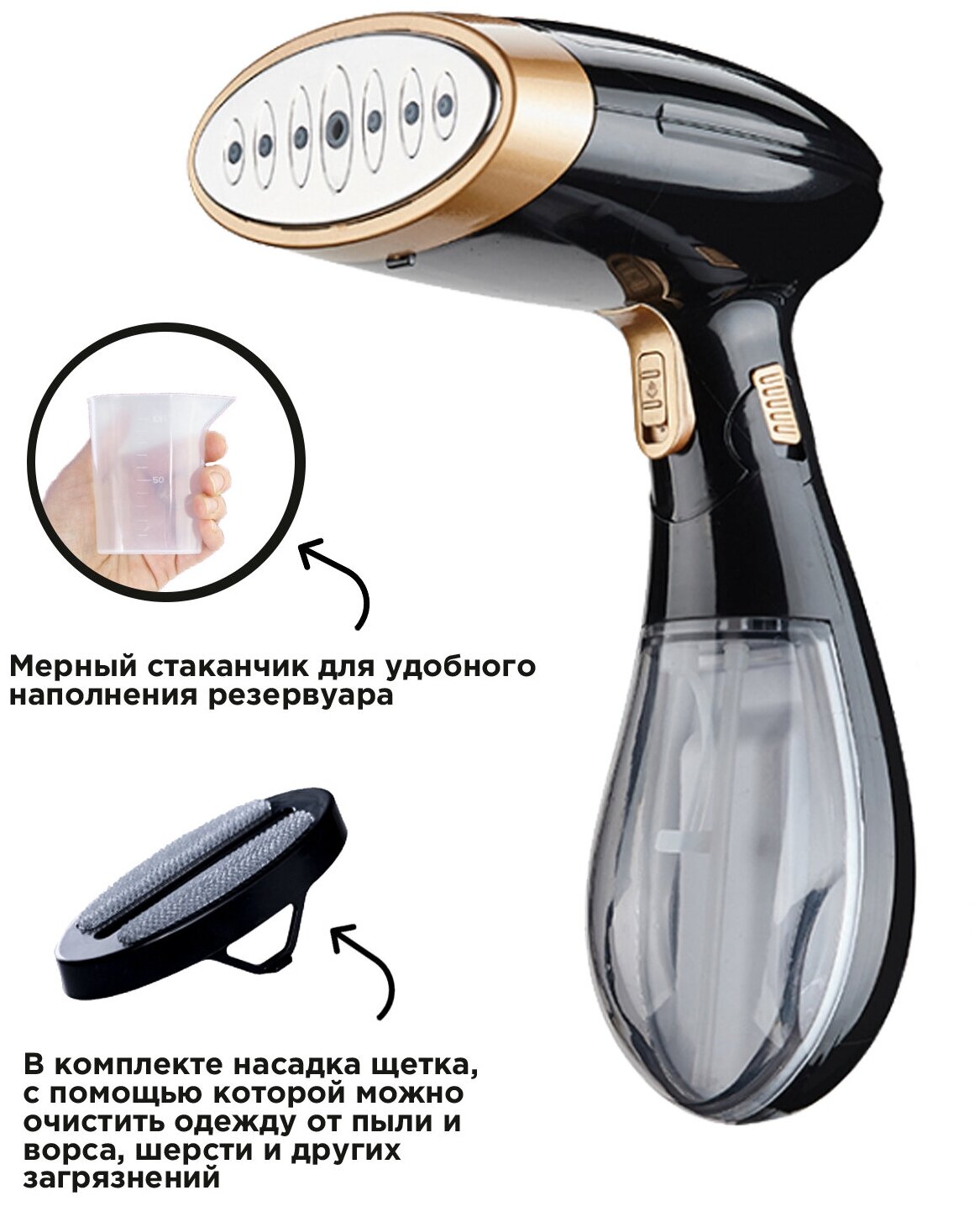 Отпариватель ручной MAGNUS, со складной ручкой, с насадкой-щеткой, мощность 1500 Вт, резервуар 130 мл, черно-золотистый информация: