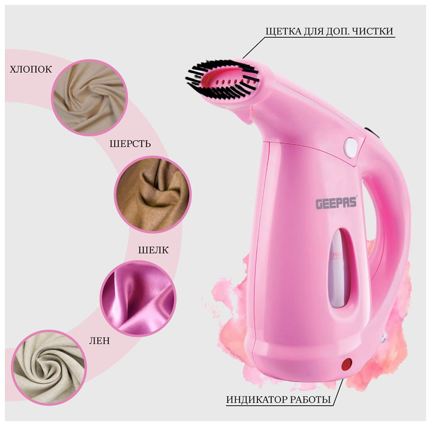 Отпариватель для одежды ручной GEEPAS GGS9693 160 мл, розовый информация: