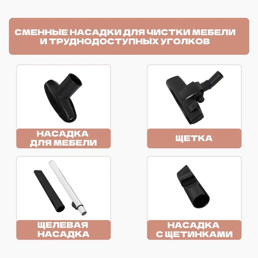 В комплекте | насадка для ламината и паркета, насадка для мягкой мебели, насадка с мягкой щетиной, универсальная насадка для сухой уборки, щелевая насадка |