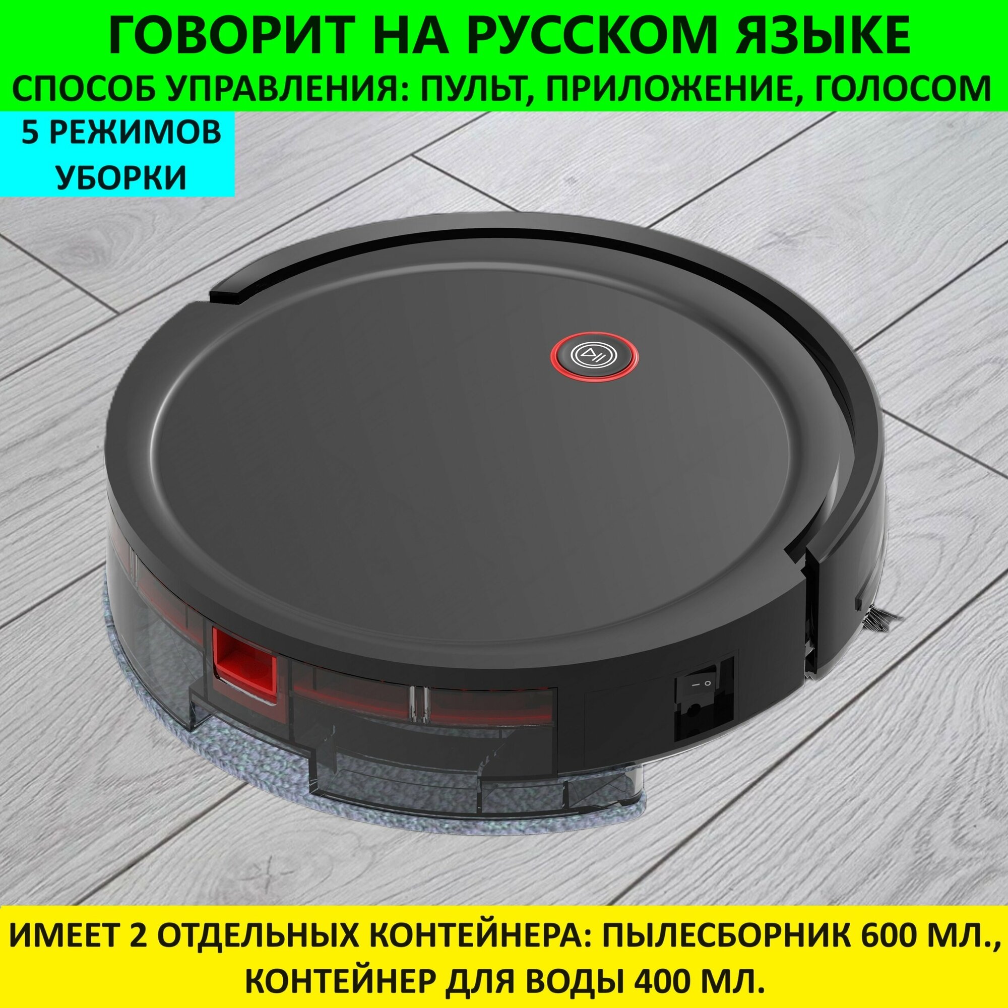 Робот пылесос для сухой и влажной уборки, Говорит на русском, робот пылесос моющий. Работает от приложения, пульта, голоса. Black информация: