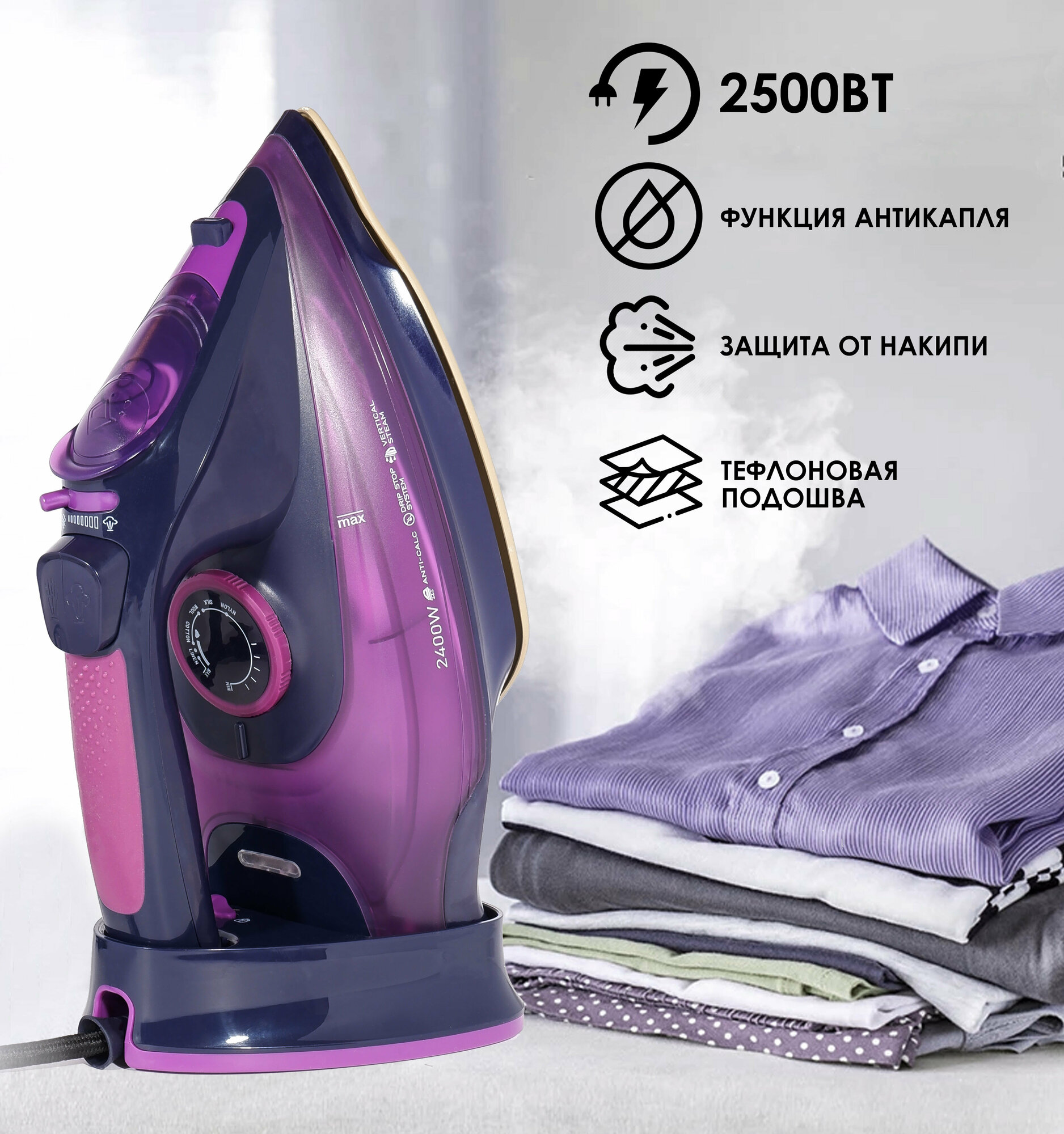 Домашний утюг беспроводной, с функцией вертикальной глажки, паровой удар, антипригарное покрытие, система самоочистки,2400Вт, фиолетовый информация: