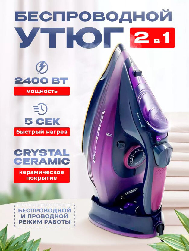 Утюг беспроводной, с функцией вертикальной глажки, паровой удар,домашний,антипригарное покрытие, система самоочистки,2500Вт, зеленый информация: